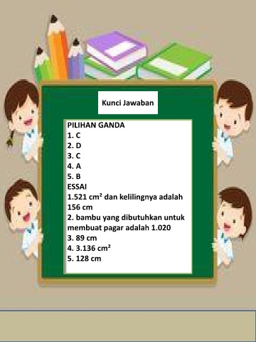 Kunci Jawaban PILIHAN GANDA 1. C 2. D 3. C 4. A 5. B ESSAI 1.521 cm² dan kelilingnya adalah 156 cm 2. bambu yang dibutuhkan untuk membuat pagar adalah 1.020 3. 89 cm 4. 3.136 cm² 5. 128 cm