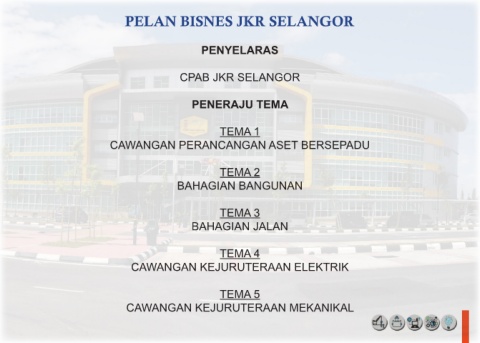 PELAN BISNES JKR SELANGOR PENYELARAS CPAB JKR SELANGOR PENERAJU TEMA TEMA 1 CAWANGAN PERANCANGAN ASET BERSEPADU TEMA 2 BAHAGIAN BANGUNAN TEMA 3 BAHAGIAN JALAN TEMA 4 CAWANGAN KEJURUTERAAN ELEKTRIK TEMA 5 CAWANGAN KEJURUTERAAN MEKANIKAL