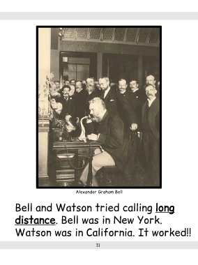 Alexander Graham Bell Bell and Watson tried calling long distance. Bell was in New York. Watson was in California. It worked!! 11