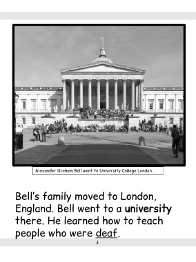 Alexander Graham Bell went to University College London. Bell’s family moved to London, England. Bell went to a university there. He learned how to teach people who were deaf. 3