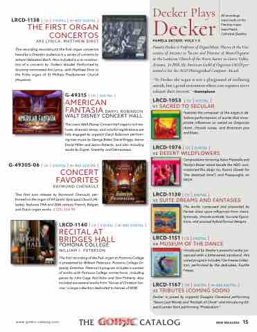 The works composed and presented by Decker draw upon influences from chant, hymnody, chorale prelude, toccata figura- tions, and unusual hybrid formal designs.