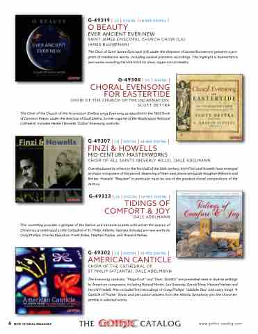 The Evensong canticles, “Magnificat” and “Nunc dimittis” are presented here in diverse settings by American composers, including Roland Martin, Leo Sowerby, Gerald Near, Howard Helvey and Harold Friedell. Also included first recordings of Craig Phillips’ “Jubilate Deo” and Larry King’s “A Canticle of Praise.” Brass and percussion players from the Atlanta Symphony join the choral en- semble in selected works.