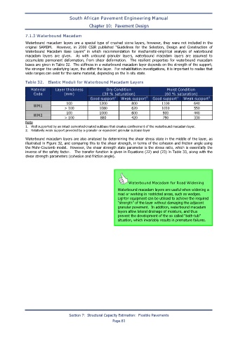 bases are given in Table 32. The stiffness in a waterbound macadam layer depends on the strength of the support;