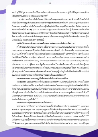 เชื้อที่กอโรคปริทันตและบางสวนของเชื้อสามารถผานระบบเลือดและเสนประสาทไปสูการติดเช้ือ ในระบบประสาทและสมองไดโดยผานเยื่อหุมสมองและไขสันหลัง เชน มีการพบเชื้อ Porphyromonas gingivalis ที่เปนเชื้อจําเพาะที่กอโรคปริทันตในสมองผูปวยอัลไซเมอร52 นอกจากนี้สารอักเสบที่เกิดจาก โรคปริทันตทําใหเกิดการกระตุนการอักเสบทั้งรางกาย รวมถึงการอักเสบของระบบประสาทและสมองผาน การสื่อสารดวย pro-inflammatory cytokines ผานทาง neural humoral และ cellular pathways เชน TNF-α, IL-1α, IL-1β และ IL-6 ที่สูงขึ้นในกระแสเลือด53 การติดเชื้อและการอักเสบเหลานี้กระตุนการ หลั่งสารอักเสบในระบบประสาทสวนกลางที่กอใหเกิดกระบวณการผลิตโปรตีนที่ชื่อวา เบตา-อไมลอยด (β-amyloid) ที่เปนอุปสรรคตอการส่ือประสาทในสมอง โดยทฤษฎีในปจจุบันเชื่อวาโปรตีนชนิดน้ีท่ีมากเกินไป จนเกิดการสะสมเปนพยาธิสภาพท่ีกอใหเกิดภาวะสมองเสื่อมแบบอัลไซเมอร2 4