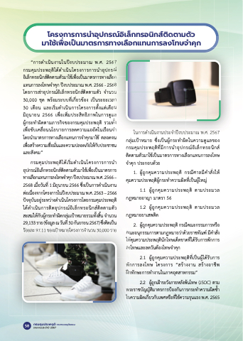 กรมคุมประพฤติไดเร่ิมดําเนินโครงการการนํา อปุ กรณอ เิ ลก็ ทรอนกิ สต ดิ ตามตวั มาใชเ พอื่ เปน มาตรการ ทางเลอื กแทนการลงโทษจําคกุ ปง บประมาณพ.ศ.2566– 2568 เมอื่ วนั ท่ี 1 มถิ นุ ายน 2566 ซงึ่ เปน การดําเนนิ งาน ตอ เนอื่ งจากโครงการในปง บประมาณพ.ศ.2563–2566 ปจ จบุ นั อยรู ะหวา งดําเนนิ โครงการโดยกรมคมุ ประพฤติ ไดดําเนินการติดอุปกรณอิเล็กทรอนิกสติดตามตัว สะสมใหก บั ผกู ระทําผดิ กลมุ เปา หมายรวมทงั้ สนิ้ จํานวน 29,133ราย(ขอ มลู ณวนั ท่ี30กนั ยายน2567)ซง่ึ คดิ เปน
