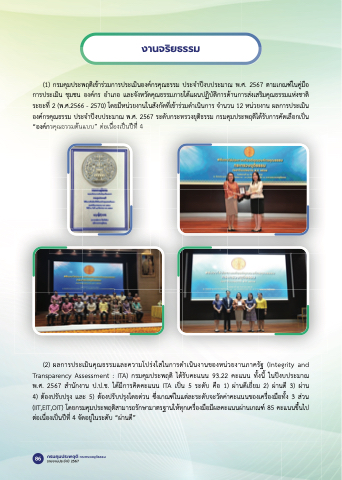 (2) ผลการประเมินคุณธรรมและความโปรงใสในการดําเนินงานของหนวยงานภาครัฐ (Integrity and Transparency Assessment : ITA) กรมคุมประพฤติ ไดรับคะแนน 93.22 คะแนน ทั้งนี้ ในปงบประมาณ พ.ศ. 2567 สํานักงาน ป.ป.ช. ไดมีการคิดคะแนน ITA เปน 5 ระดับ คือ 1) ผานดีเยี่ยม 2) ผานดี 3) ผาน 4) ตองปรับปรุง และ 5) ตองปรับปรุงโดยดวน ซึ่งเกณฑในแตละระดับจะวัดคาคะแนนของเคร่ืองมือทั้ง 3 สวน (IIT,EIT,OIT) โดยกรมคุมประพฤติสามารถรักษามาตรฐานใหทุกเครื่องมือมีผลคะแนนผานเกณฑ 85 คะแนนข้ึนไป ตอเนื่องเปนปที่ 4 จัดอยูในระดับ “ผานดี”