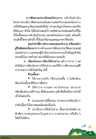 การติดตามประเมินผลโครงการ หลังเริ่มดําเนิน โครงการควรมีการติดตามประเมินผลวาแตละกิจกรรมของโครงการ กอใหเกิดผลตามวัตถุประสงคหรือไม หากพบปญหาก็จะสามารถแกไข ไดทันเวลา ดังนั้น จึงตองนําเสนอไววาจะติดตามประเมินผลดวยวิธีใด ทั้งในขั้นตอนการดําเนินกิจกรรม และหลังจบโครงการแลว พรอมทั้ง ระบุตัวชี้วัดความสําเร็จ ทั้งในแงปริมาณและคุณภาพวาคืออะไร