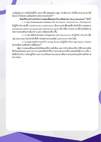 มีปฏิกิริยากับยาฆาเช้ือ Clarithromycin, Erythromycin เน่ืองจากยาฆาเชื้อกลุมน้ีอาจไปยับย้ังการยอยสลาย (metabolism) ของยา Donepezil และ Galantamine นอกจากนี้การใชย า NSAIDs หากใชรวมกันมีโอกาส เกิดการระคายเคืองทางเดินอาหาร และการเลือดออกท่ีมากขึ้น