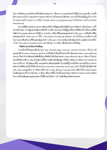 ควรเลือกใชวัสดุอุดฟนในกลุม high viscosity glass- ionomer cement (HV-GICs) เนื่องจากมี คุณสมบัติ fluoride releasing และสามารถยึดติดกับฟนทั้งในสวนที่ปกติและสวนของ caries-affected dentin ซึ่งตางกับเรซินคอมโพสิตซึ่งมีแรงยึดติดกับฟนในสวนของ caries-affected dentin นอยกวาในสวน ของเนื้อฟนปกติมาก เหมาะกับผูปวยที่มีความเสี่ยงเกิดฟนผุสูง หรือมีรากฟนผุ หากตองการความสวยงาม สามารถใช GIC เปนวัสดุรองพื้น และอุดดวยเรซินคอมโพสิต ในกรณีที่ผูปวยไมใหความรวมมือในการรักษา ไมสามารถใชหัวกรอได ใหเลือกรักษาตาม atraumatic restorative technique (ART) ใชเครื่องมือเพื่อกําจัด soft caries และอุดดวย GI หรืออาจใชการทา silver diamine fluoride (SDF) เพื่อยับยั้งการลุกลามของ โรคฟนผุและทาซ้ําอยางนอยทุก 6 เดือน หรืออาจถี่ขึ้น โดยขึ้นอยูกับสุขภาพชองปากและภาวะความเสี่ยง ในการเกิดโรคฟนผุของแตละบุคคล ท้ังนี้ตองระวังไมทา SDF ในฟนที่ผุทะลุโพรงประสาท