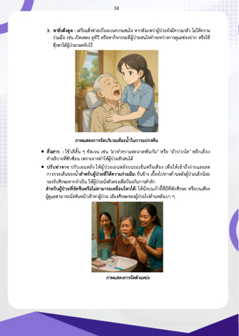 • สื่อสาร : ใชวลีสั้น ๆ ชัดเจน เชน "มาทําความสะอาดฟนกัน" หรือ "อาปากโต" หลีกเลี่ยง คําอธิบายที่ซับซอน เพราะอาจทําใหผูปวยสับสนได