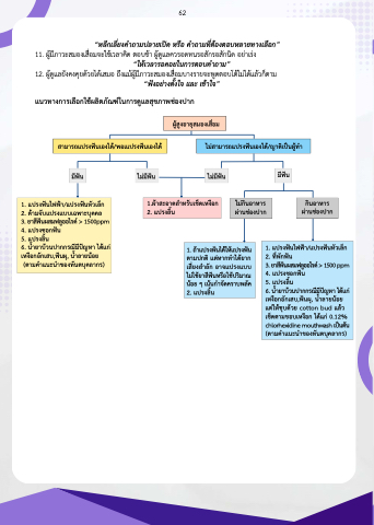 1. ถา แปรงฟน ไดใ หแ ปรงฟน ตามปกติ แตหากทําไดยาก เสี่ยงสําลัก อาจแปรงแบบ ไมใ ชย าสฟี น หรอื ใชป รมิ าณ นอ ย ๆ เนน กําจดั คราบพลคั 2. แปรงลิ้น