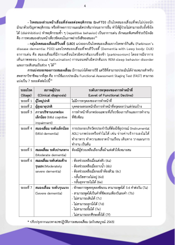การแบงระยะของภาวะสมองเสื่อม มีการแบงไดหลายวิธี แตวิธีที่สามารถประเมินไดงายเหมาะสําหรับ สหสาขาวิชาชีพมากที่สุด คือ การใชแบบประเมิน Functional Assessment Staging Test (FAST) สามารถ แบงเปน 7 ระยะดังตอไปน1้ี 5