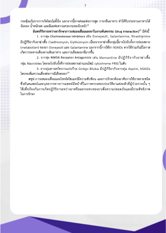 มีปฏิกิริยากับยาฆาเช้ือ Clarithromycin, Erythromycin เน่ืองจากยาฆาเชื้อกลุมน้ีอาจไปยับย้ังการยอยสลาย (metabolism) ของยา Donepezil และ Galantamine นอกจากนี้การใชย า NSAIDs หากใชรวมกันมีโอกาส เกิดการระคายเคืองทางเดินอาหาร และการเลือดออกท่ีมากขึ้น