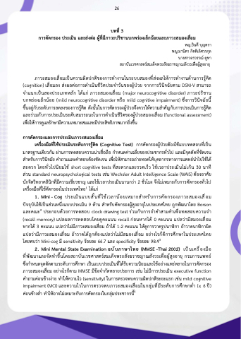 ภาวะสมองเสื่อมเปนความผิดปกติของการทํางานในระบบสมองที่สงผลใหการทํางานดานการรูคิด (cognition) เสื่อมลง สงผลตอการดําเนินชีวิตประจําวันของผูปวย จากการวินิจฉัยตาม DSM-V สามารถ จําแนกเปนสองประเภทหลัก ไดแก ภาวะสมองเสื่อม (major neurocognitive disorder) ภาวะปริชาน บกพรองเล็กนอย (mild neurocognitive disorder หรือ mild cognitive impairment) ซึ่งการวินิจฉัยน้ี ข้ึนอยูกับระดับการลดลงของการรูคิด ดังน้ันในการคัดกรองผูปวยจึงควรใหความสําคัญกับการประเมินการรูคิด และรวมกับการประเมินระดับสมรรถนะในการดําเนินชีวิตของผูปวยสมองเสื่อม (functional assessment) เพ่ือใหการดูแลรักษามีความเหมาะสมและมีประสิทธิภาพมากยิ่งขึ้น
