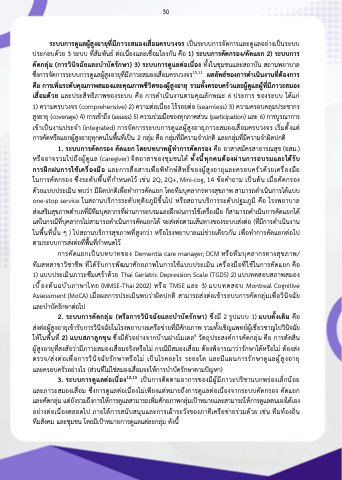 ระบบการดูแลผูสูงอายุที่มีภาวะสมองเสื่อมครบวงจร เปนระบบการจัดการและดูแลอยางเปนระบบ ประกอบดวย 3 ระบบ ที่สัมพันธ ตอเนื่องและเชื่อมโยงกัน คือ 1) ระบบการคัดกรอง/คัดแยก 2) ระบบการ คัดกลุม (การวินิจฉัยและบําบัดรักษา) 3) ระบบการดูแลตอเนื่อง ทั้งในชุมชนและสถาบัน สถานพยาบาล ซึ่งการจัดการระบบการดูแลผูสูงอายุท่ีมีภาวะสมองเส่ือมครบวงจร10,11 ผลลัพธของการดําเนินงานที่ตองการ คือ การเพิ่มระดับคุณภาพสมองและคุณภาพชีวิตของผูสูงอายุ รวมทั้งครอบครัวและผูดูแลผูที่มีภาวะสมอง เสื่อมดวย และประสิทธิภาพของระบบ คือ การดําเนินงานตามคุณลักษณะ 6 ประการ ของระบบ ไดแก 1) ความครบวงจร (comprehensive) 2) ความตอเนื่อง ไรรอยตอ (seamless) 3) ความครอบคลุมประชากร สูงอายุ (coverage) 4) การเขาถึง (assess) 5) ความรวมมือของทุกภาคสวน (participation) และ 6) การบูรณาการ เขาเปนงานประจํา (integrated) การจัดการระบบการดูแลผูสูงอายุภาวะสมองเสื่อมครบวงจร เริ่มตั้งแต การคัดหรือแยกผูสูงอายุทุกคนในพื้นท่ีเปน 2 กลุม คือ กลุมท่ีมีความจําปกติ และกลุมที่มีความจําผิดปกติ
