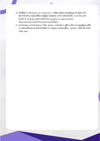 14. จันทพิมพ ศ, Maneephun N, Chaiwong N. การพัฒนาชุดกิจกรรมภูมิปญญาปราชญชาวบาน ตอการปองกันภาวะสมองเส่ือม ของผูสูงอายุในชุมชน. RDHSJ [อินเทอรเน็ต]. 5 มกราคม 2023 [อางถึง 25 กรกฎาคม 2025];15(3):85-98. available at: https://he02.tci- thaijo.org/index.php/RDHSJ/article/view/258019