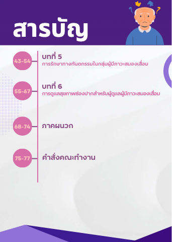สารบญั บทท่ี 5 ่ การรกั ษาทางทนั ตกรรมในกลุ่มผูม้ ีภาวะสมองเสือม บทท่ี 6 ่ การดแู ลสขุ ภาพชอ่ งปากสาํ หรบั ผดู้ แู ลผมู้ ภี าวะสมองเสอื ม ภาคผนวก คาํ สงั คณะทาํ งาน 43-54 55-67 68-74 75-77