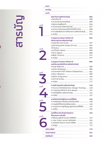 สมดิุล (Balance) ................................................................. 080 จุดิเดิน (Emphasis) ............................................................ 086 ลวดิลายและการซ้ํา (Pattern & Repetition) ............... 091 จังหวะ (Rhythm) ................................................................ 099 สัดิสวน (Proportion) ........................................................ 103 เอกภาพ (Unity) .................................................................. 111 บูทสรุป................................................................................... 117