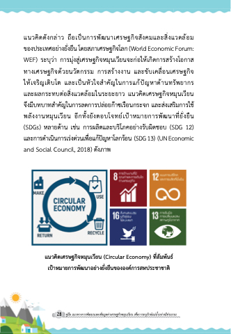 แนวคิดดังกลาว ถือเปนการพัฒนาเศรษฐกิจสังคมและสิ่งแวดลอม ของประเทศอยางยงั่ยนื โดยสภาเศรษฐกจิโลก(WorldEconomicForum: WEF) ระบุวา การมุงสูเศรษฐกิจหมุนเวียนจะกอใหเกิดการสรางโอกาส ทางเศรษฐกิจดวยนวัตกรรม การสรางงาน และขับเคล่ือนเศรษฐกิจ ใหเจริญเติบโต และเปนหัวใจสําคัญในการแกปญหาดานทรัพยากร และผลกระทบตอส่ิงแวดลอมในระยะยาว แนวคิดเศรษฐกิจหมุนเวียน จึงมีบทบาทสําคัญในการลดการปลอยกาซเรือนกระจก และสงเสริมการใช พลังงานหมุนเวียน อีกทั้งยังตอบโจทยเปาหมายการพัฒนาที่ย่ังยืน (SDGs) หลายดาน เชน การผลิตและบริโภคอยางรับผิดชอบ (SDG 12) และการดาํ เนนิ การเรง ดว นเพอื่ แกป ญ หาโลกรอ น (SDG 13) (UN Economic and Social Council, 2018) ดังภาพ