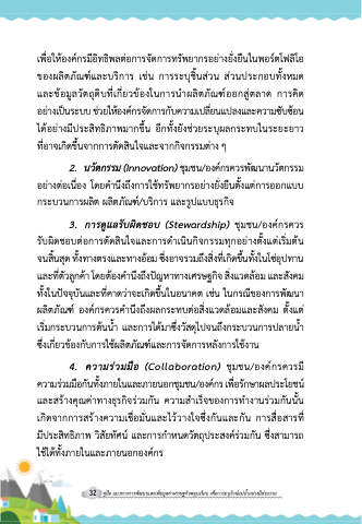 2. นวตั กรรม(Innovation)ชมุ ชน/องคก รควรพฒั นานวตั กรรม อยางตอเนื่อง โดยคํานึงถึงการใชทรัพยากรอยางย่ังยืนต้ังแตการออกแบบ กระบวนการผลิต ผลิตภัณฑ/บริการ และรูปแบบธุรกิจ