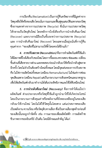 การเรยี กคนื (Reclamation) เปน การกคู นื ทรพั ยากรทมี่ มี ลู คา จาก วสั ดเุ หลอื ใชห รอื ของเสยี โดยเนน การแยกและฟน ฟคู ณุ สมบตั เิ ฉพาะของวสั ดุ ซึ่งอาจแตกตางจากการแปรสภาพ (Recycle) ที่เนนการแปรสภาพวัสดุ ใหกลายเปนวัตถุดิบใหม โดยหลักการใกลเคียงกับการนํากลับคืนมาใหม (Recover) และบางกรณีถือเปนขั้นระหวางการแปรสภาพ (Recycle) และ การนํากลับคืนมาใหม (Recover) โดยเฉพาะเมื่อมุงเนนท่ีการกูคืน คุณคาจาก “ของเสียที่ไมสามารถใชซ้ําโดยตรงไดอีกแลว”