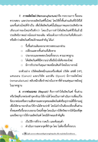 7. การผลิตใหม(Remanufacture)คือกระบวนการรื้อถอน ตรวจสอบ และประกอบผลิตภัณฑขึ้นใหม โดยใชทั้งชิ้นสวนเดิมที่ยังใชได และชิ้นสวนใหมที่จําเปน เพื่อใหผลิตภัณฑนั้นมีคุณภาพและประสิทธิภาพ เทียบเทาของใหมหรือดีกวา โดยเปนการทําใหผลิตภัณฑที่ใชแลวมี ประสิทธิภาพอยางนอยเทาของเดิม พรอมดวยการรับประกันท่ีเทียบเทา หรือดีกวาผลิตภัณฑใหมลักษณะสําคัญ ไดแก