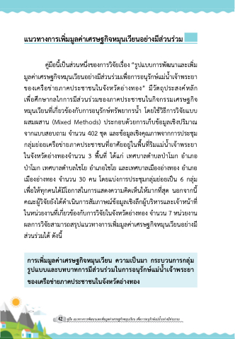 คมู อื นเี้ ปน สว นหนง่ึ ของการวจิ ยั เรอื่ ง “รปู แบบการพฒั นาและเพมิ่ มูลคาเศรษฐกิจหมุนเวียนอยางมีสวนรวมเพื่อการอนุรักษแมน้ําเจาพระยา ของเครือขายภาคประชาชนในจังหวัดอางทอง” มีวัตถุประสงคหลัก เพื่อศึกษากลไกการมีสวนรวมของภาคประชาชนในกิจกรรมเศรษฐกิจ หมุนเวียนท่ีเกี่ยวของกับการอนุรักษทรัพยากรน้ํา โดยใชวิธีการวิจัยแบบ ผสมผสาน (Mixed Methods) ประกอบดวยการเก็บขอมูลเชิงปริมาณ จากแบบสอบถาม จํานวน 402 ชุด และขอมูลเชิงคุณภาพจากการประชุม กลุมยอยเครือขายภาคประชาชนที่อาศัยอยูในพื้นที่ริมแมนํ้าเจาพระยา ในจังหวัดอางทองจํานวน 3 พ้ืนที่ ไดแก เทศบาลตําบลปาโมก อําเภอ ปาโมก เทศบาลตําบลไชโย อําเภอไชโย และเทศบาลเมืองอางทอง อําเภอ เมืองอางทอง จํานวน 30 คน โดยแบงการประชุมกลุมยอยเปน 6 กลุม เพื่อใหทุกคนไดมีโอกาสในการแสดงความคิดเห็นใหมากที่สุด นอกจากนี้ คณะผูวิจัยยังไดดําเนินการสัมภาษณขอมูลเชิงลึกผูบริหารและเจาหนาท่ี ในหนวยงานท่ีเกี่ยวของกับการวิจัยในจังหวัดอางทอง จํานวน 7 หนวยงาน ผลการวิจัยสามารถสรุปแนวทางการเพิ่มมูลคาเศรษฐกิจหมุนเวียนอยางมี สวนรวมได ดังนี้