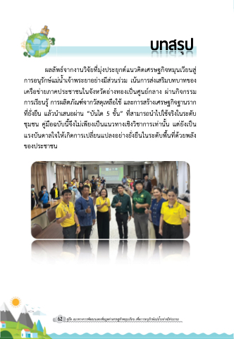 ผลลัพธจากงานวิจัยท่ีมุงประยุกตแนวคิดเศรษฐกิจหมุนเวียนสู การอนุรักษแมน้ําเจาพระยาอยางมีสวนรวม เนนการสงเสริมบทบาทของ เครือขายภาคประชาชนในจังหวัดอางทองเปนศูนยกลาง ผานกิจกรรม การเรียนรู การผลิตภัณฑจากวัสดุเหลือใช และการสรางเศรษฐกิจฐานราก ที่ยั่งยืน แลวนําเสนอผาน “บันได 5 ข้ัน” ที่สามารถนําไปใชจริงในระดับ ชุมชน คูมือฉบับนี้จึงไมเพียงเปนแนวทางเชิงวิชาการเทานั้น แตยังเปน แรงบันดาลใจใหเกิดการเปลี่ยนแปลงอยางยั่งยืนในระดับพื้นที่ดวยพลัง ของประชาชน