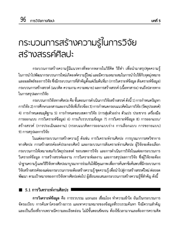 ในแต่ละกระบวนการสร้างความรู้ ดังเช่น การวิเคราะห์งานศิลปะ การบูรณาการสหวิชาการ ทางศิลปะ การสร้างสรรค์องค์ประกอบศิลป์ และกระบวนการสังเคราะห์งานศิลปะ ผู้วิจัยจะต้องเลือก กระบวนการให้เหมาะสมกับวัตถุประสงค์ ขอบเขตการวิจัย และการดาเนินการวิจัยในแต่ละกระบวนการ วิเคราะห์ข้อมูล การสร้างสรรค์ผลงาน การวิเคราะห์ผลงาน และการสรุปผลการวิจัย ซึ่งผู้วิจัยจะต้อง นา ฐานความรู้และวธิ วี จิ ยั ทางศลิ ปะมาบรู ณาการรว่ มกนั ใหม้ คี ณุ ภาพเพอื่ การคน้ หาขอ้ คน้ พบทมี่ กี ระบวนการ วจิ ยั สรา้ งสรรคข์ องแตล่ ะกระบวนการจะตอ้ งสรา้ งความรู้ ชดุ ความรู้ เพอื่ นา ไปสกู่ ารสรา้ งสรรคใ์ หม่ ตอ่ ยอด พัฒนา ตามเป้าหมายของการวิจัยทางศิลปะต่อไป ผู้เขียนจะเสนอกระบวนการสร้างความรู้ที่สาคัญ ดังนี้