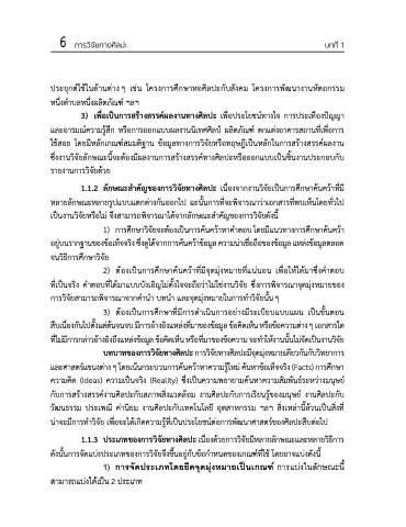 1.1.2 ลักษณะสาคัญของการวิจัยทางศิลปะ เนื่องจากงานวิจัยเป็นการศึกษาค้นคว้าที่มี หลายลักษณะหลายรูปแบบแตกต่างกันออกไป ฉะนั้นการที่จะพิจารณาว่าเอกสารที่พบเห็นโดยทั่วไป เป็นงานวิจัยหรือไม่ จึงสามารถพิจารณาได้จากลักษณะสาคัญของการวิจัยดังนี้