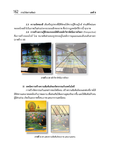 2.4 การสร้างความรู้สึกของระยะมิติด้วยหลักวิชาทัศนียภาพวิทยา (Perspective) คือการสร้างระยะใกล้ ไกล ขนาดสัดส่วนของรูปทรงอยู่ในหลักการมุมมองและเส้นระดับสายตา (ภาพที่ 6-18)