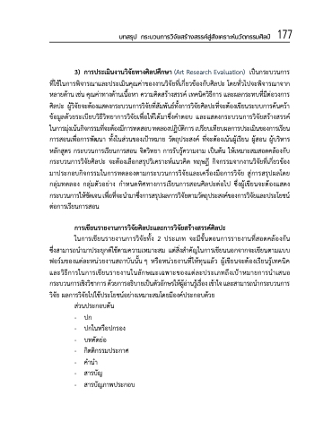 3) การประเมินงานวิจัยทางศิลปศึกษา (Art Research Evaluation) เป็นกระบวนการ ที่ใช้ในการพิจารณาและประเมินคุณค่าของงานวิจัยที่เกี่ยวข้องกับศิลปะ โดยทั่วไปจะพิจารณาจาก หลายด้าน เช่น คุณค่าทางด้านเนื้อหา ความคิดสร้างสรรค์ เทคนิควิธีการ และผลกระทบที่มีต่อวงการ ศลิ ปะ ผวู้ จิ ยั จะตอ้ งแสดงกระบวนการวจิ ยั ทสี่ มั พนั ธท์ งั้ การวจิ ยั ศลิ ปะทจี่ ะตอ้ งเขยี นระบบการคน้ ควา้ ข้อมูลด้วยระเบียบวิธีวิทยาการวิจัยเพื่อให้ได้มาซึ่งคาตอบ และแสดงกระบวนการวิจัยสร้างสรรค์ ในการมงุ่ เนน้ กจิ กรรมทจี่ ะตอ้ งมกี ารทดสอบ ทดลองปฏบิ ตั กิ าร เปรยี บเทยี บผลการประเมนิ ของการเรยี น การสอนเพื่อการพัฒนา ทั้งในส่วนของเป้าหมาย วัตถุประสงค์ ที่จะต้องเน้นผู้เรียน ผู้สอน ผู้บริหาร หลักสูตร กระบวนการเรียนการสอน จิตวิทยา การรับรู้ความงาม เป็นต้น ให้เหมาะสมสอดคล้องกับ กระบวนการวิจัยศิลปะ จะต้องเลือกสรุปวิเคราะห์แนวคิด ทฤษฎี กิจกรรมจากงานวิจัยที่เกี่ยวข้อง มาประกอบกิจกรรมในการทดลองตามกระบวนการวิจัยและเครื่องมือการวิจัย สู่การสรุปผลโดย กลุ่มทดลอง กลุ่มตัวอย่าง กาหนดทิศทางการเรียนการสอนศิลปะต่อไป ซึ่งผู้เขียนจะต้องแสดง กระบวนการใหช้ ดั เจน เพอื่ ทจี่ ะนา มาซงึ่ การสรปุ ผลการวจิ ยั ตามวตั ถปุ ระสงคข์ องการวจิ ยั และประโยชน์ ต่อการเรียนการสอน