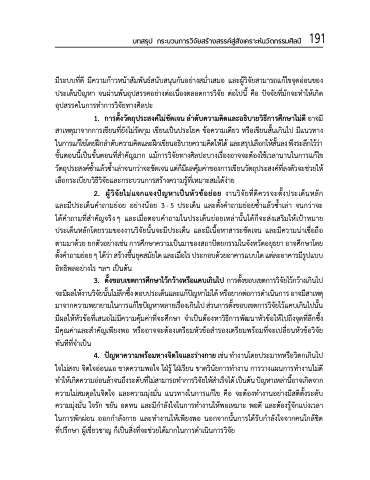 2. ผู้วิจัยไม่แจกแจงปัญหาเป็นหัวข้อย่อย งานวิจัยที่ดีควรจะตั้งประเด็นหลัก และมีประเด็นคาถามย่อย อย่างน้อย 3-5 ประเด็น และตั้งคาถามย่อยซ้าแล้วซ้าเล่า จนกว่าจะ ได้คาถามที่สาคัญจริงๆ และเมื่อตอบคาถามในประเด็นย่อยเหล่านั้นได้ก็จะส่งเสริมให้เป้าหมาย ประเด็นหลักโดยรวมของงานวิจัยนั้นจะมีประเด็น และมีเนื้อหาสาระชัดเจน และมีความน่าเชื่อถือ ตามมาด้วย ยกตัวอย่างเช่น การศึกษาความเป็นมาของสถาปัตยกรรมในจังหวัดอยุธยา อาจศึกษาโดย ตงั้ คา ถามยอ่ ย ๆ ไดว้ า่ สรา้ งขนึ้ ยคุ สมยั ใด และเมอื่ ไร ประกอบดว้ ยอาคารแบบใด แตล่ ะอาคารมรี ปู แบบ อิทธิพลอย่างไร ฯลฯ เป็นต้น