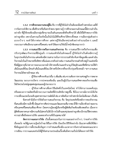 1.3.2 การศึกษาผลงานของผู้อื่นคือการที่ผู้วิจัยไม่จาเป็นต้องลงมือสร้างสรรค์เองแต่ใช้ การวเิ คราะห์ ตคี วาม เพอื่ ศกึ ษาหรอื คน้ หาคา ตอบ ชดุ ความรู้ การศกึ ษาผลงานลกั ษณะนมี้ คี วามจา เปน็ อย่างยิ่ง ที่ผู้วิจัยจะต้องเลือกกลุ่มที่สามารถเป็นตัวแทนของสิ่งที่จะศึกษาได้ เพื่อให้ได้คาตอบการวิจัย อย่างถูกต้อง เพราะในความเป็นจริงนั้นเป็นไปไม่ได้ที่จะศึกษาให้ครบทั้งหมด การเลือกกลุ่มตัวอย่าง แบบกว้าง ๆ จะทาให้ยากต่อการศึกษา แต่หากผู้วิจัยเลือกหน่วยตัวอย่างจานวนน้อย ๆ และมี กระบวนการคัดเลือกมาเฉพาะที่โดดเด่น จะทาให้ผลงานวิจัยมีน้าหนักชัดเจนมากกว่า