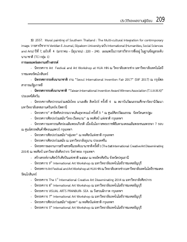3) 2557. Mural painting of Southern Thailand : The Multi-cultural Integration for contrmporary image.วํารสํารวชิ ํากํารVeridianE-Journal,SilpakornUniversityฉบบั International(Humanities,SocialSciences and Arts) ปีที่ 7, ฉบับที่ 4 (มกรําคม – มิถุนํายน) : 220 – 240. เผยแพร่ในวํารสํารวิชํากํารซึ่งอยู่ ในฐํานข้อมูลระดับ นํานําชําติ (TCI กลุ่ม 1)
