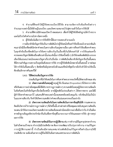 การเลอื กหวั ขอ้ ปญั หาวจิ ยั เปน็ การตดั สนิ ใจวา่ ผวู้ จิ ยั สนใจทจี่ ะทา วจิ ยั เรอื่ งอะไร ตามปกตแิ ลว้ คนเรามักมีเรื่องที่สงสัยใคร่หาคาตอบในคราวเดียวกันอยู่หลายเรื่อง แต่การที่จะทาวิจัยเพื่อหาคาตอบ ในทุกหัวข้อเรื่องที่สงสัยในการวิจัยคราวเดียวกันเป็นเรื่องที่เกินวิสัยจะทาได้ การวิจัยแต่ละครั้ง ควรจะตอบปญั หาไดเ้ พยี งเรอื่ งเดยี วเทา่ นนั้ กอ่ น ดงั นนั้ การวจิ ยั ครงั้ หนงึ่ ๆ นกั วจิ ยั จะตอ้ งตดั สนิ ใจ เจาะจง เลือกให้แน่นอนว่าสนใจจะตอบปัญหาเกี่ยวกับเรื่องใด การตัดสินใจเลือกหัวข้อปัญหาจึงเป็นขั้นตอน ที่มีความสาคัญมากเพราะเป็นจุดเริ่มต้นของการวิจัย หากผู้วิจัยตัดสินใจพลาดในขั้นตอนนี้ อาจส่งผล ให้การวิจัยในขั้นตอนอื่นๆ ติดขัดหรือมีอุปสรรคไปด้วยและที่หนักที่สุดก็อาจถึงกับทาให้งานวิจัยน้ัน ต้องล้มเลิกกลางคันเลยก็ได้