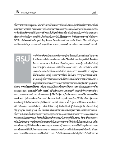 การวจิ ยั ทางศลิ ปะมผี ลกระทบตอ่ การอนรุ กั ษ์สบื สานสบื ทอดตอ่ ยอดในผลงาน ดา้ นศลิ ปกรรมทปี่ ระกอบดว้ ยผลงานดา้ นวจิ ติ รศลิ ป์ และประยกุ ตศ์ ลิ ป์ ซงึ่ จะตอ้ ง มีกระบวนการเฉพาะด้านศิลปะ ท่ีจะต้องบูรณาการความรู้ร่วมกันเพื่อนาไปสู่ องค์ความรู้จากกระบวนการวิจัยท่ีมีคุณภาพของการอธิบายเชิงวิชาการที่มี เหตุผล โดยแสดงให้เห็นและเน้นถึงท่ีมา กระบวนการ ผลการวิจัย การสรุปผล ให้เกิดแนวคิด ทฤษฎี กระบวนการใหม่ ข้อค้นพบ การบุกเบิกชายแดนใหม่ ทางความรู้ เพื่อการพัฒนา การนาไปใช้ประโยชน์ด้านศิลปกรรม โดยมีแนวทาง ใหผ้ วู้ จิ ยั ไดเ้ ลอื กกระบวนการวจิ ยั ในการคน้ หาคา ตอบตามวตั ถปุ ระสงค์ จดุ มงุ่ หมาย