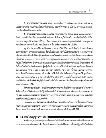3. จากแหลง่ ภายนอกหรอื สงิ่ แวดลอ้ ม เชน่ เสยี งรบกวน สถานทไี่ มเ่ หมาะสมและมตี วั แปร อีกประเภทหนึ่งที่อาจมีผลกระทบต่อตัวแปรตาม ซึ่งไม่อาจรู้ได้ล่วงหน้าว่าจะเกิดขึ้นหรือไม่ จึงไม่ สามารถควบคมุ ได้ ตวั แปรเหลา่ นเี้ รยี กวา่ ตวั แปรสอดแทรก (Intervening Variable) เชน่ ภาวะสขุ ภาพ ความวิตกกังวล ความตื่นเต้น ความโกรธ แรงจูงใจ อิทธิพลทางความคิด เป็นต้น