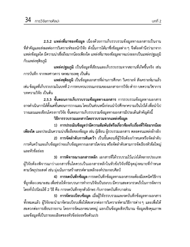 2.5.3 ขั้นตอนการเก็บรวบรวมข้อมูลทางเอกสาร การรวบรวมข้อมูลทางเอกสาร อาจดา เนนิ การไดต้ งั้ แตข่ นั้ ตอนการวางแผน โดยเปน็ สว่ นหนงึ่ กอ่ นนา ไปศกึ ษาความเปน็ ไปได้ เพอื่ นา ไป วางแผนและเขียนโครงการวิจัย ขั้นตอนการเก็บรวบรวมข้อมูลทางเอกสารมีประเด็นสาคัญดังนี้