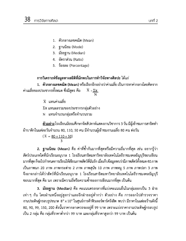 ตัวอย่าง โรงเรียนมัธยมศึกษาจัดสัปดาห์แสดงงานวิชาการ 3 วัน มีผู้เข้าชมการสาธิตทา ผ้าบาติกในแต่ละวันจานวน 80, 110, 50 คน มีจานวนผู้เข้าชมงานเฉลี่ย 80 คน ต่อวัน