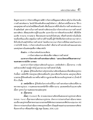 2) เทคนิควิธีการ ผู้วิจัยต้องวิเคราะห์กลวิธีในการสร้างสรรค์ผลงานศิลปะที่มีความ หลากหลายรูปแบบ การแสดงออกของเทคนิควิธีการที่มีความงาม และสอดคล้องกับแนวความคิด เนื้อหา รูปทรง ในการแสดงออกของแต่ละบุคคล