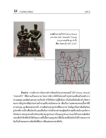 ตัวอย่าง: การอธิบายการวิเคราะห์การจัดองค์ประกอบของเฮนรี่ มัวร์ (Henry Moore) “ครอบครัว” ที่มีความเป็นเอกภาพ โดยการจัดวางให้เป็นโครงสร้างรูปสามเหลี่ยมด้วยหลักการ ความสมดุล และสัดส่วนตามความเป็นจริง ทาให้เกิดความรู้สึกมั่นคง เป็นอันหนึ่งอันเดียวกัน ทิศทาง ของการจัดรูปทรงที่พุ่งประสานเข้าหาจุดที่น่าสนใจของภาพ เพื่อเป็นการแสดงออกของเน้ือหาที่มี ความอบอุ่น ผูกพันของครอบครัว ตามสัดส่วนของรูปทรงที่มีเอกภาพ โดยมีลูกเป็นสายสัมพันธ์ของ รูปทรงที่เกาะเกี่ยวเชื่อมโยงกัน และเพื่อเป็นการบังคับสายตาของผู้ชมเข้าหาจุดที่น่าสนใจ และจัดวาง เปิดช่องว่างของรูปทรงด้วยจังหวะลีลาของรูปทรงภายในและรูปทรงภายนอกให้ประสานสัมพันธ์ กลมกลนื กบั ทวิ ทศั นท์ า ใหเ้ กดิ เอกภาพทงั้ เนอื้ หาและรปู ทรง ทมี่ ปี รมิ าตรลนื่ ไหลไปกบั ทวี่ า่ งของอากาศ อันเป็นทักษะและความคิดเห็นที่ต้องการสื่อแสดงออกของศิลปิน