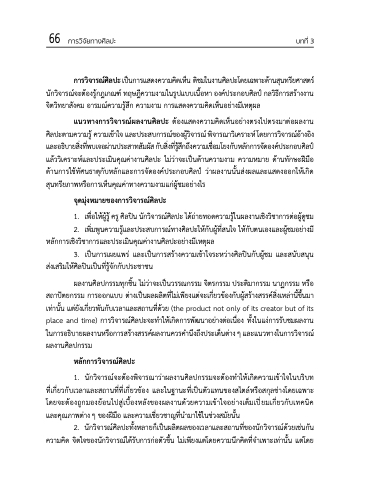 ผลงานศิลปกรรมทุกชิ้น ไม่ว่าจะเป็นวรรณกรรม จิตรกรรม ประติมากรรม นาฏกรรม หรือ สถาปัตยกรรม การออกแบบ ต่างเป็นผลผลิตที่ไม่เพียงแต่จะเกี่ยวข้องกับผู้สร้างสรรค์สิ่งเหล่านี้ขึ้นมา เท่านั้น แต่ยังเกี่ยวพันกับเวลาและสถานที่ด้วย (the product not only of its creator but of its place and time) การวิจารณ์ศิลปะจะทาให้เกิดการพัฒนาอย่างต่อเนื่อง ทั้งในแง่การรับชมผลงาน ในการอธบิ ายผลงานหรอื การสรา้ งสรรคผ์ ลงานควรคา นงึ ถงึ ประเดน็ ตา่ ง ๆ และแนวทางในการวจิ ารณ์ ผลงานศิลปกรรม