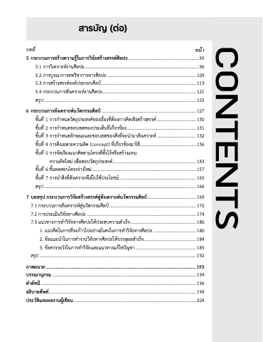 6 กระบวนการสังเคราะห์นวัตกรรมศิลป์....................................................................................127 ขั้นที่ 1 การกาหนดวัตถุประสงค์ของเรื่องที่ต้องการคิดเชิงสร้างสรรค์...................................130 ขั้นที่ 2 การกาหนดขอบเขตของประเด็นที่เกี่ยวข้อง.............................................................. 131 ขั้นที่ 3 การกาหนดลักษณะและขอบเขตของสิ่งที่จะนามาสังเคราะห์ ................................... 132 ขั้นที่ 4 การดึงเฉพาะความคิด (concept) ที่เกี่ยวข้องมาใช.้.................................................136 ขั้นที่ 5 การจัดเรียงแนวคิดตามโครงที่ตั้งไว้หรือสร้างแทน