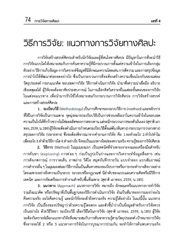 การวิจัยสร้างสรรค์ศิลปะสาหรับนักวิจัยและผู้ที่สนใจทางศิลปะ มีปัญหาในการที่จะนาวิธี การวิจัยแบบใดให้เหมาะสมกับการค้นหาความรู้ที่มีกระบวนการตั้งแต่ความเข้าใจในการเลือกกลุ่ม ตวั อยา่ ง วธิ กี ารเกบ็ ขอ้ มลู การวเิ คราะหข์ อ้ มลู ทมี่ ลี กั ษณะความโดดเดน่ การตคี วาม และการสรปุ ขอ้ มลู การนาไปใช้พัฒนาต่อยอดอย่างไร ซึ่งเป็นกระบวนการที่จะต้องสร้างความเชื่อมโยงกันของแต่ละ วัตถุประสงค์ กรอบแนวคิด ขอบเขตการวิจัย วิธีการดาเนินการวิจัย นามาซึ่งความน่าเชื่อถือ อธิบาย เชิงเหตุผลได้ ผู้วิจัยจะต้องอาศัยประสบการณ์ ในการเลือกคิดวิเคราะห์ในแต่ละข้ันตอนของการวิจัย ในแต่ละแนวทาง เพื่อนามาปรับใช้ให้เหมาะสมกับกระบวนการวิจัยศิลปะ การวิจัยสร้างสรรค์ และการสร้างสรรค์ศิลปะ