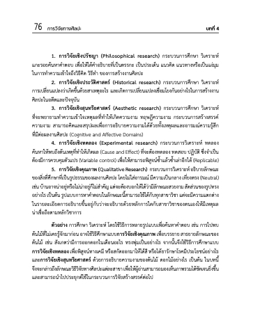 1. การวิจัยเชิงปรัชญา (Philosophical research) กระบวนการศึกษา วิเคราะห์ แกะรอยค้นหาคาตอบ เพื่อให้ได้คาอธิบายที่เป็นตรรกะ เป็นประเด็น แนวคิด แนวทางหรือเป็นแง่มุม ในการทาความเข้าใจถึงวิธีคิด วิธีทา ของการสร้างงานศิลปะ