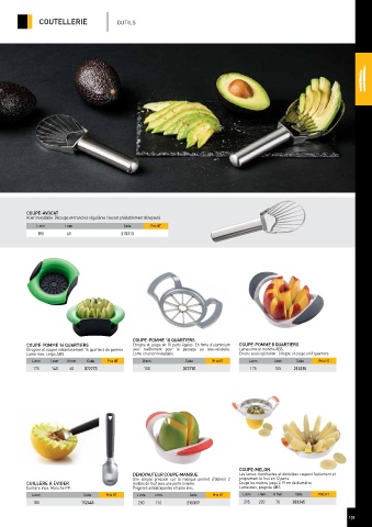 Acier inoxydable. Découpe en tranches régulières l’avocat préalablement dénoyauté.