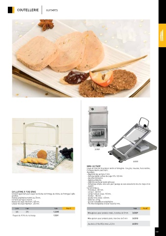 Coupe en tranches de produits tendre et homogène : foie gras, mousses, fruits tendres,