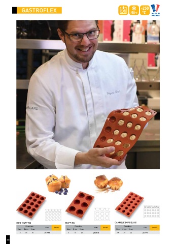 GASTROFLEX MINI-MUFFINS MUFFINS CANNELÉ BORDELAIS Empreintes Empreintes Empreintes Nbre Ø mm H mm Code Prix HT Nbre Ø mm H mm Code Prix HT Nbre Ø mm H mm Code Prix HT 15 45 30 257914 6 70 38 257915 18 35 35 257990 308