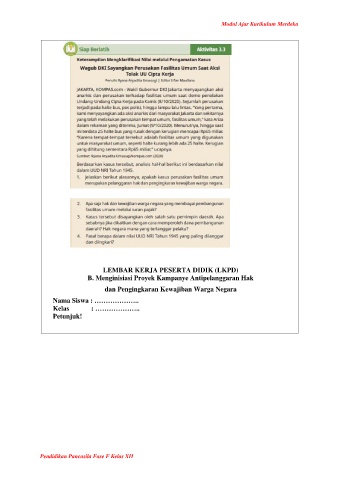 Modul Ajar Kurikulum Merdeka LEMBAR KERJA PESERTA DIDIK (LKPD) B. Menginisiasi Proyek Kampanye Antipelanggaran Hak dan Pengingkaran Kewajiban Warga Negara Nama Siswa : ……………….. Kelas : ……………….. Petunjuk! Pendidikan Pancasila Fase F Kelas XII